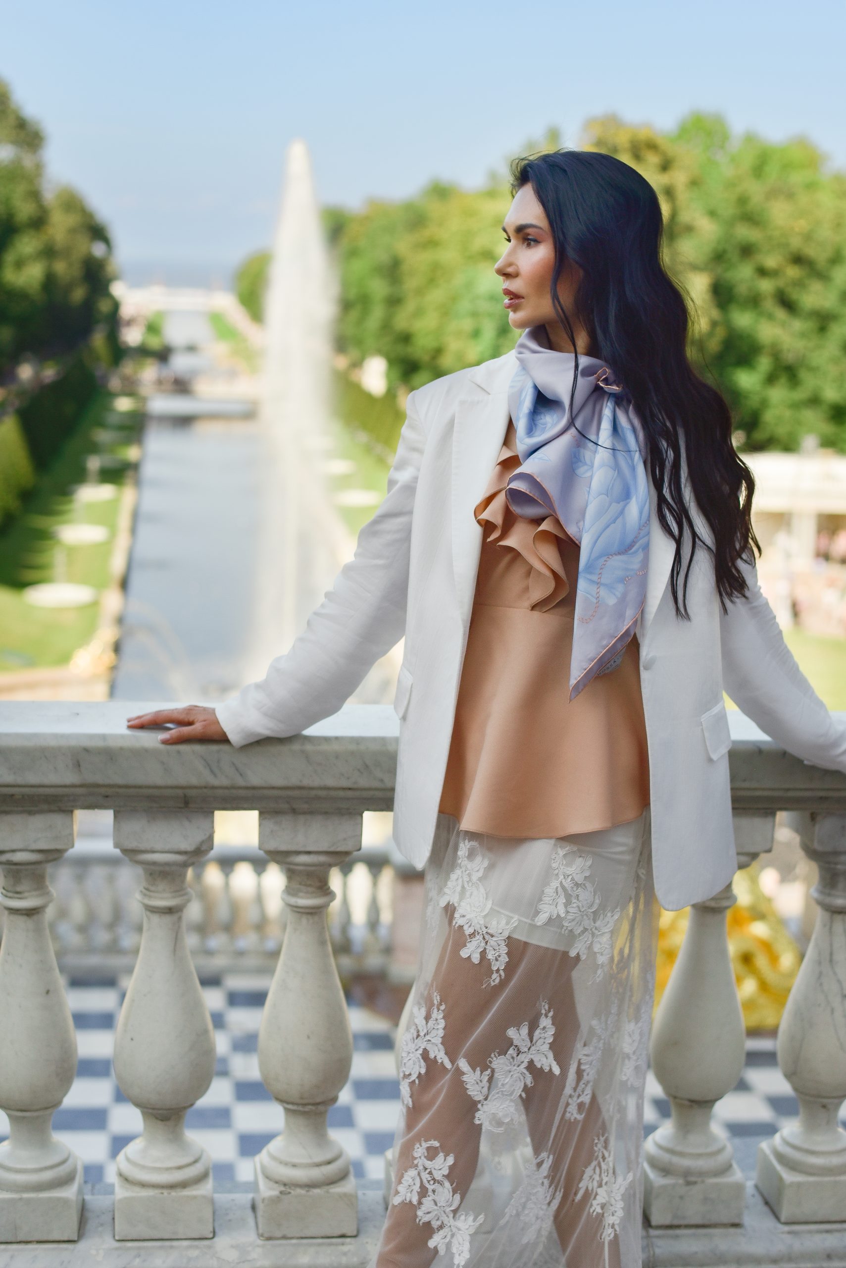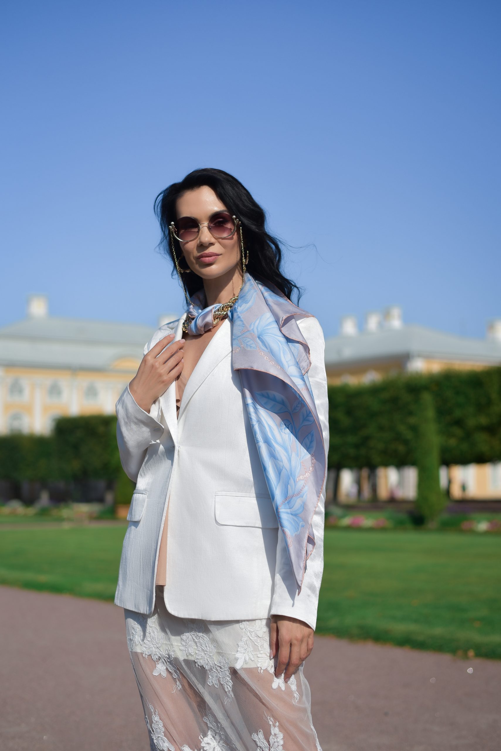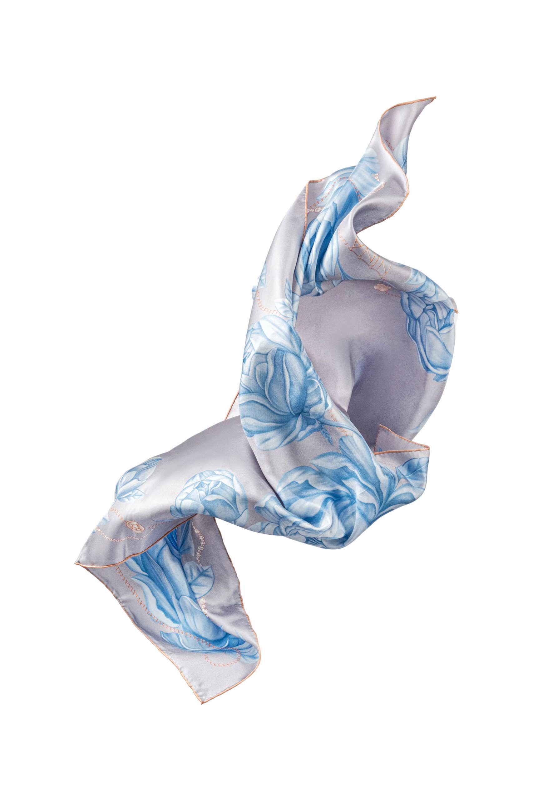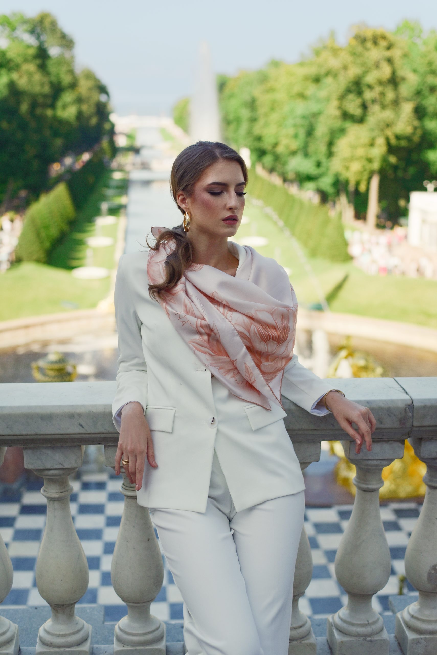 Платок «Пионы» создан совместно с бутиком премиальной флористики Rossa. Воспетый поэтами Востока и художниками Запада, многослойный пион символизирует любовь, гармонию и процветание.